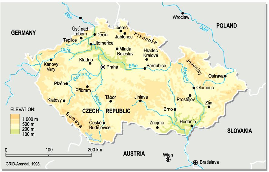 La république tchèque carte d'altitude. République tchèque carte d'altitude (Europe de l'est - Europe) à imprimer. République tchèque carte d'altitude (Europe de l'est - Europe) à télécharger. Sněžka ou Śnieżka (en tchèque et en polonais, Schneekoppe en allemand) est une montagne à la frontière entre la République tchèque et la Pologne, le point le plus proéminent de la crête silésienne dans les montagnes Krkonoše, comme le montre sa carte d'altitude de la République tchèque. Avec ses 1 602 mètres (5 256 pieds), son sommet est le point le plus élevé de la République tchèque, des Monts Krkonoše et de l'ensemble de la chaîne des Sudètes. Un côté de la montagne se trouve en Pologne, l'autre appartient à la République tchèque