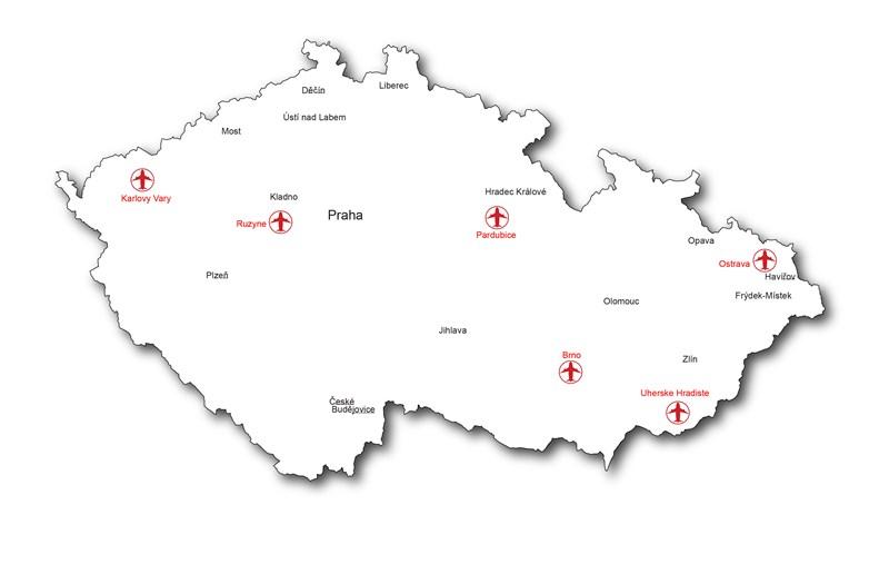 La république tchèque carte d'aéroports. Aéroports de république tchèque de la carte (Europe de l'est - Europe) à imprimer. Aéroports de république tchèque de la carte (Europe de l'est - Europe) à télécharger. L'aéroport international Ruzyně de Prague est le principal aéroport international du pays. En 2010, il a accueilli 11,6 millions de passagers, ce qui en fait l'aéroport le plus fréquenté d'Europe centrale et orientale. Au total, la République tchèque compte 46 aéroports avec des pistes pavées, dont six assurent des services aériens internationaux à Brno, Karlovy Vary, Mošnov (près d'Ostrava), Pardubice, Prague et Kunovice (près d'Uherské Hradiště), comme le montre la carte des aéroports de la République tchèque.