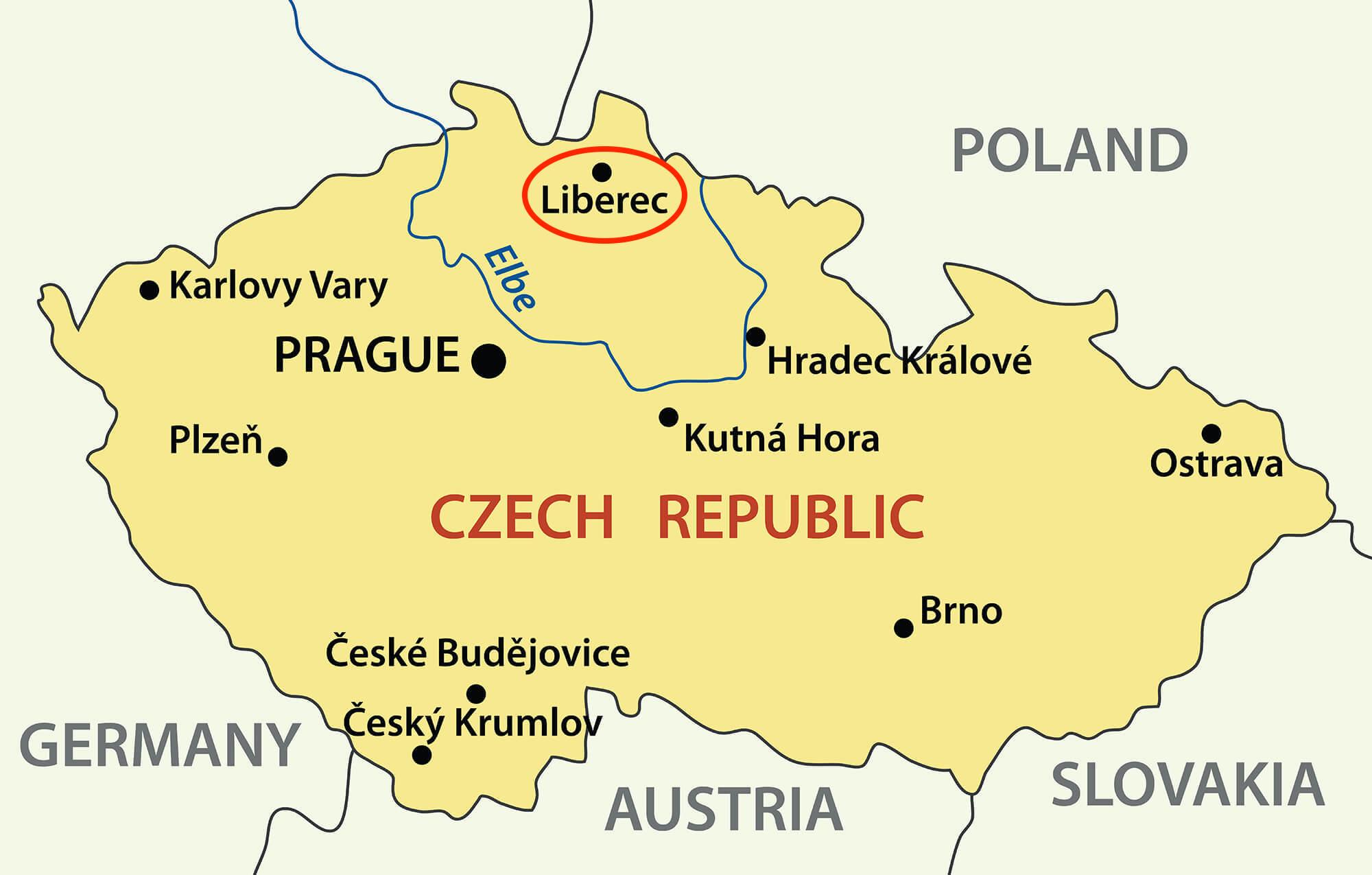 Liberec se trouve dans la vallée de la rivière Lužická Nisa (en allemand : Lausitzer Neisse) au milieu des Monts des Géants (Krkonoše), comme indiqué sur la carte de la République tchèque de Liberec. Fondée au XIIIe siècle et dotée d'une charte en 1577, Liberec a été habitée principalement par des Allemands jusqu'à leur expulsion après la Seconde Guerre mondiale. Surnommée le "Manchester de Bohème", Liberec est un centre textile depuis le XVIe siècle, fabriquant principalement des tissus, des tapis, des tapisseries et des tissus en coton et en soie. Le musée municipal de Bohême du Nord possède une collection exceptionnelle de tapisseries flamandes médiévales. Après 1945, la ville a été repeuplée par les Tchèques et a connu un renouveau de l'industrie, notamment de la production traditionnelle de textiles et de verre. Population. (2007 est.) 98 781.